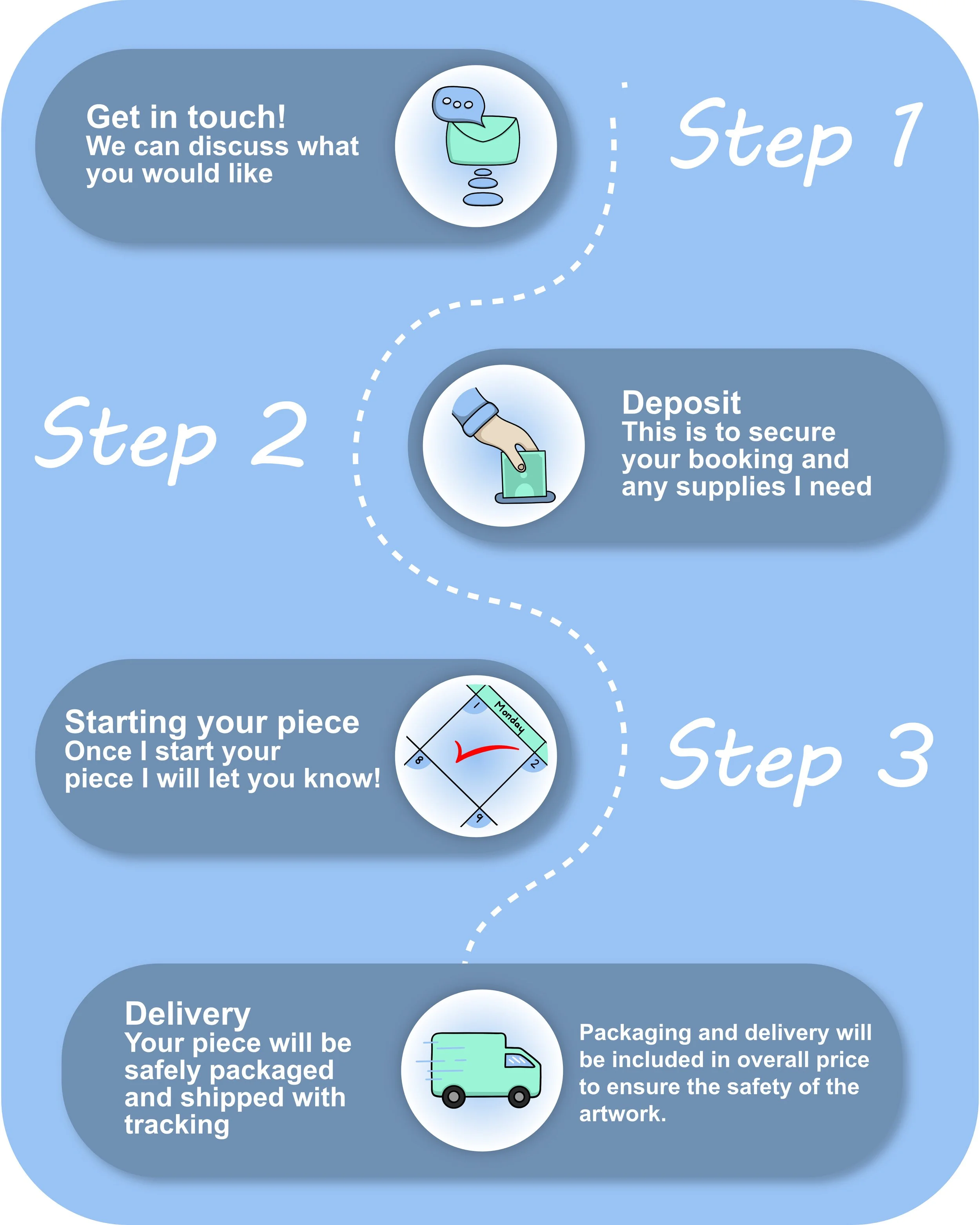 These illustrations starting at £100, depending on size and medium, this may also vary based on postage. This will all be discussed when needed.